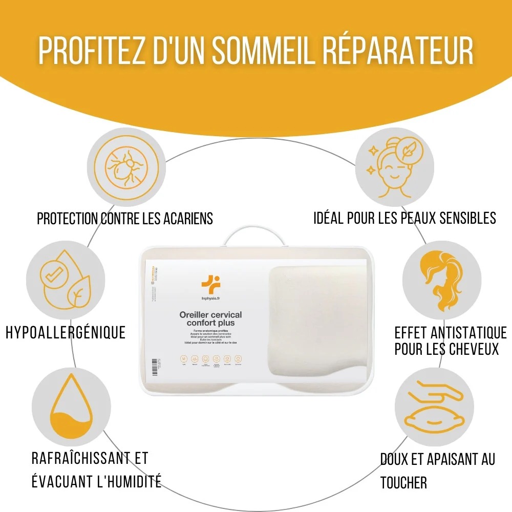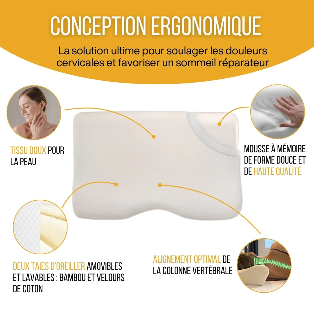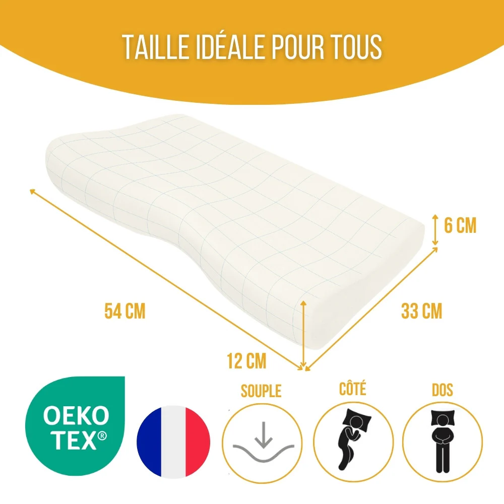 Oreiller Ergonomique à Mémoire de Forme CONFORT PLUS - la solution parfaite pour un confort apaisant et un soulagement thérapeutique de la colonne cervicale.